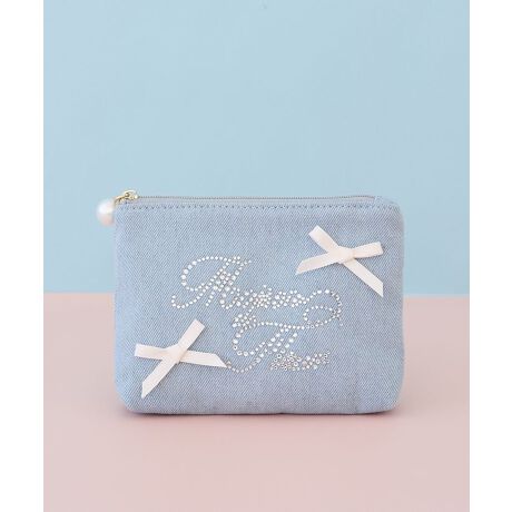 デニム生地に煌めくラインストーンロゴが華やかなポーチ。