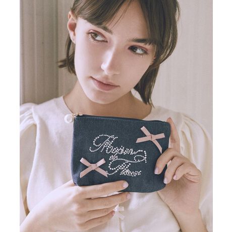 デニム生地に煌めくラインストーンロゴが華やかなポーチ。