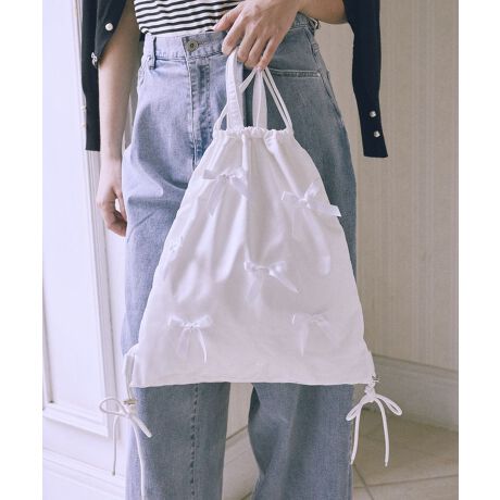 カジュアルになりがちなナップサックを、リボンデザインでガーリーな印象に仕上げました♪