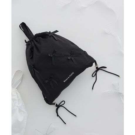 微光沢のある生地に、サテンリボンを散りばめたナップサック。