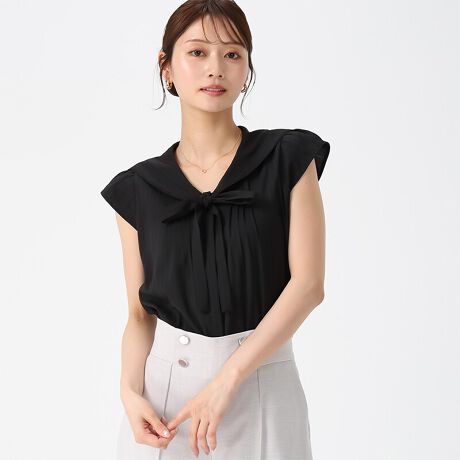 セーラーカラーにレーストリムをあしらったブラウス。リボンデザインがさりげないアクセントになり、上品で女性らしい印象を与えます。スカートでやわらかく、パンツで程よく引き締めたスタイリングもおすすめです。