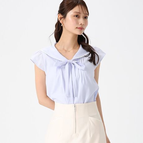 セーラーカラーにレーストリムをあしらったブラウス。リボンデザインがさりげないアクセントになり、上品で女性らしい印象を与えます。スカートでやわらかく、パンツで程よく引き締めたスタイリングもおすすめです。
