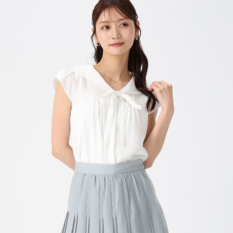 セーラーカラーにレーストリムをあしらったブラウス。リボンデザインがさりげないアクセントになり、上品で女性らしい印象を与えます。スカートでやわらかく、パンツで程よく引き締めたスタイリングもおすすめです。