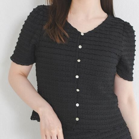 凹凸感のあるぽこぽことした素材が、一枚で今季らしく着映えるカットトップス。