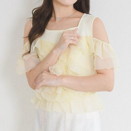 2026春夏新作 パウダーシフォンラッフルレイヤード肩開きニット