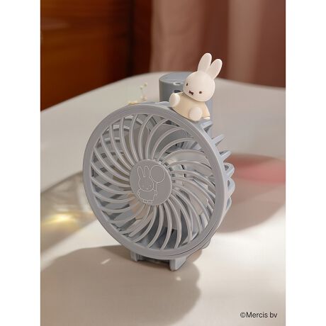 [型番:393-PXXP067]持ち運びに便利な、ミッフィーのハンディファン。手持ち部分を折ると自立するため、机に置いてハンドフリーでも使用できます。