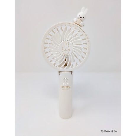 [型番:393-PXXP067]持ち運びに便利な、ミッフィーのハンディファン。手持ち部分を折ると自立するため、机に置いてハンドフリーでも使用できます。
