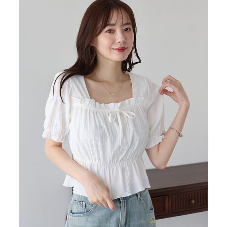 スクエアネックリボンギャザーブラウス