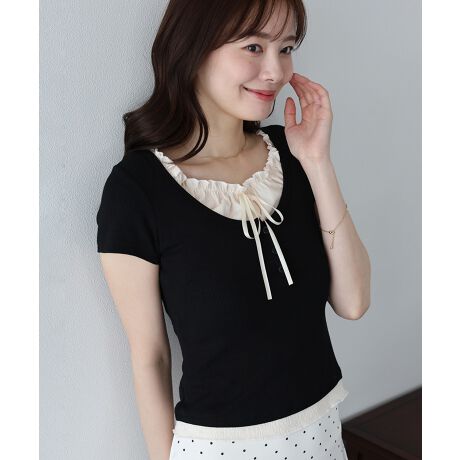 ネックからのぞかせたギャザーとリボンが、シンプルなカットソーに甘さをプラス。