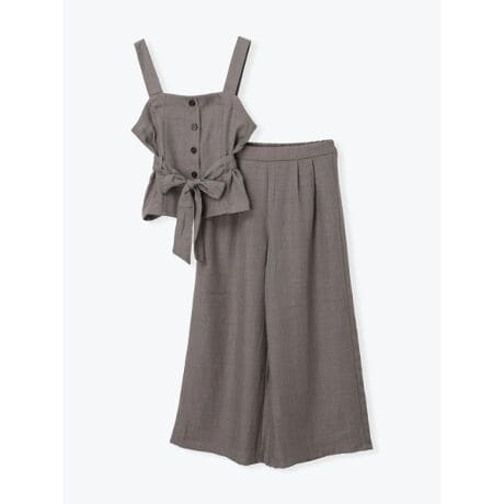 ビスチェはウエストリボンでシルエット調整ができ、パンツはイージー仕様でリラックス感のある穿き心地に仕上げています。
