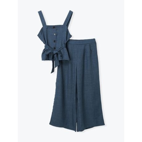 [型番:26550725385]麻調素材のナチュラルな風合いが魅力のセットアップ。ビスチェはウエストリボンでシルエット調整ができ、パンツはイージー仕様でリラックス感のある穿き心地に仕上げています。上下で着るだけでコーディネートが完成する、着回し力の高いアイテムです。それぞれ単品使いもでき、スタイリングの幅が広がります。