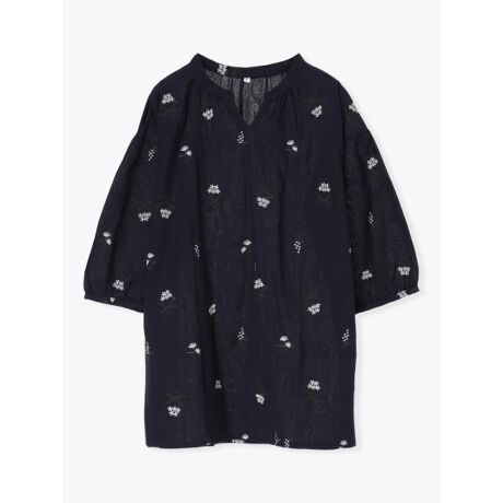 綿麻小花刺繍ルーズシルエットキーネックブラウス