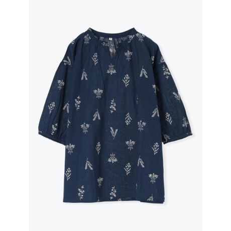綿麻小花刺繍キーネックブラウス