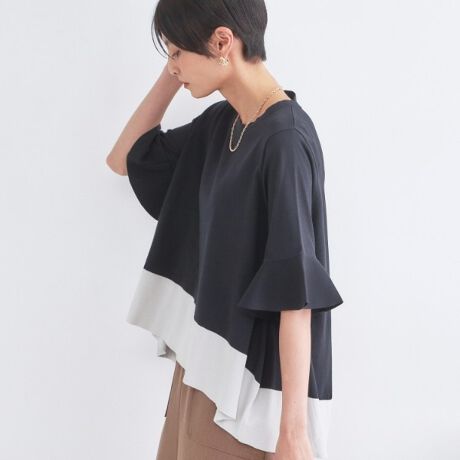 ・裾の配色や袖のフレアデザイン、裾にかけてフレアに広がるシルエットが着映える一枚。