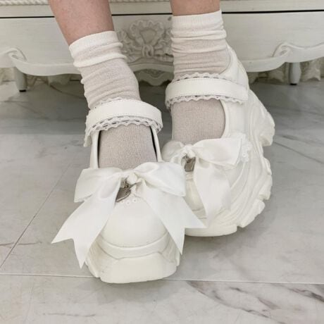 フリルのようなレースがあしらわれたストラップや、つま先のリボンが足元をさらに可憐に演出。