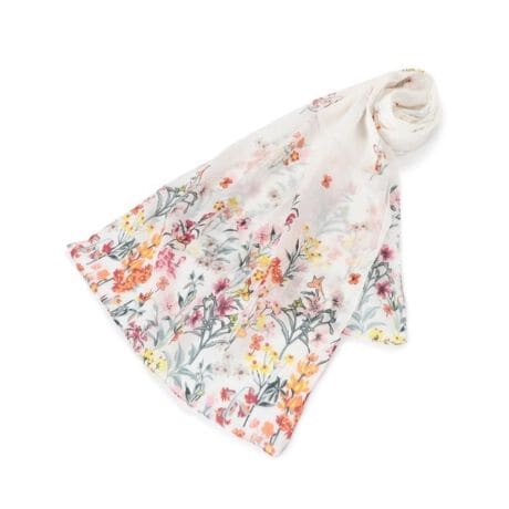 優しい色合いで顔まわりを華やかに。グラデーション調のフラワープリントがやわらかく広がるストール。
