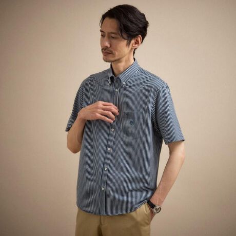 暑い夏時期に適した超ハイゲージジャガードで編み上げた接触冷感機能付きストライプカットソー素材の半袖ボタンダウンシャツ。