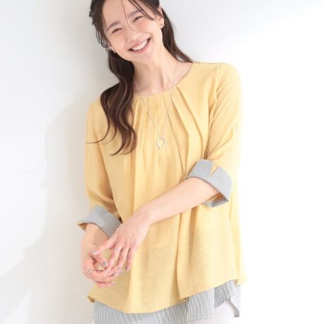腰周りが隠れる着丈で体系カバーも出来て、七分袖デザインも軽やかな印象のスタイリングになります。