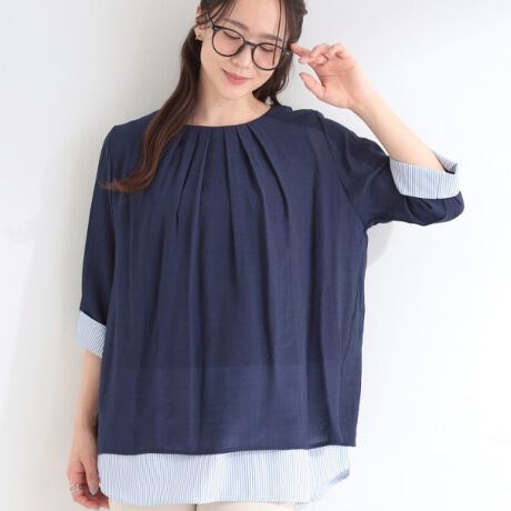 腰周りが隠れる着丈で体系カバーも出来て、七分袖デザインも軽やかな印象のスタイリングになります。