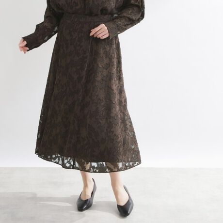 シフォンジャガード柄とシアーチェック柄の2素材の展開になり、それぞれ異なる表情を楽しめるのも魅力で、トップスをインしてもバランスよく決まり、きれいめスタイリングに活躍してくれる一枚です。