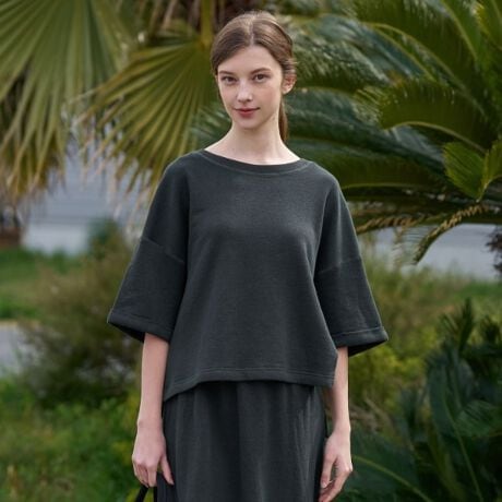 ●ゆったりとした肘までかかるハーフスリーブで、リラクシー感と涼しさを両立