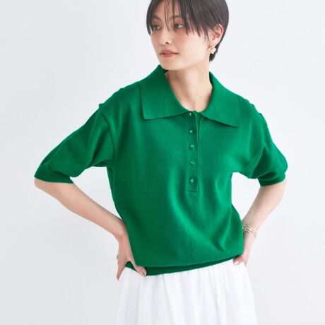 ・大きめのポロ衿と前立て部分についた同色クリア釦がポイント。