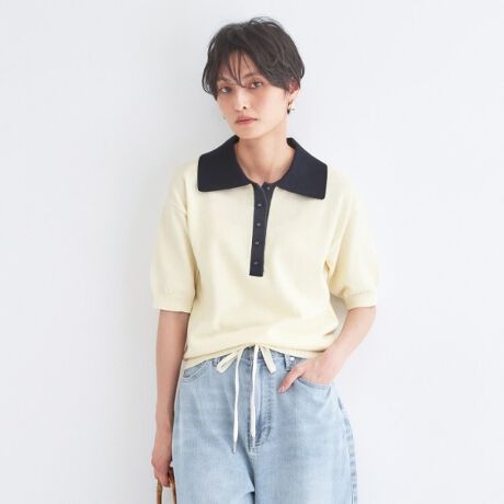 ・大きめのポロ衿と前立て部分についた同色クリア釦がポイント。
