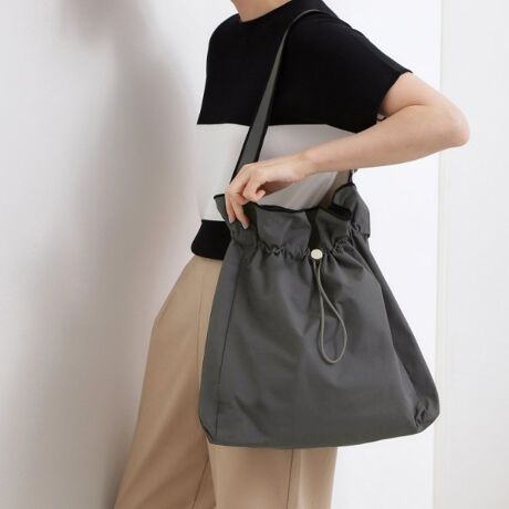 口元はドローストリング仕様でキュッと絞れ、ハンドルと口元に施した配色トリミングがコーディネートのアクセントになります。