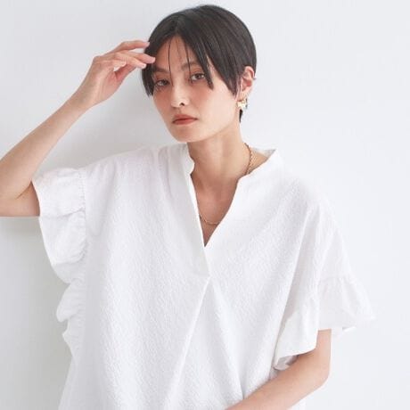 凹凸感のあるサッカー素材がポイント!袖のフリルが華やかなスキッパーブラウス