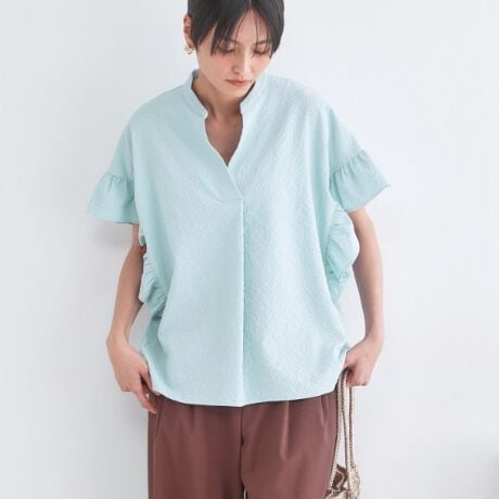 凹凸感のあるサッカー素材がポイント!袖のフリルが華やかなスキッパーブラウス