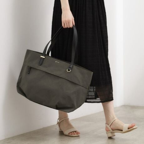 撥水素材で急な天候変化にも心強く、きれいめな合皮ハンドルが大人っぽく持てるポイントです。