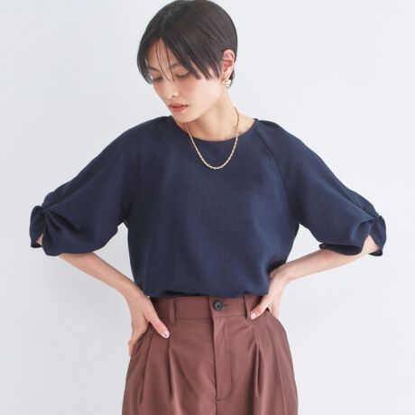 お手入れ簡単な麻調素材で、さらりと着られるタックスリーブデザインブラウス