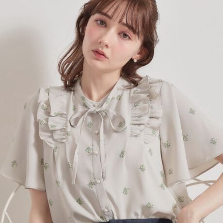 ドットに花のブーケ柄をあわせた可憐なプリント柄のブラウスです