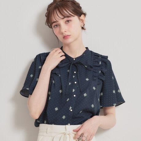 ドットに花のブーケ柄をあわせた可憐なプリント柄のブラウスです