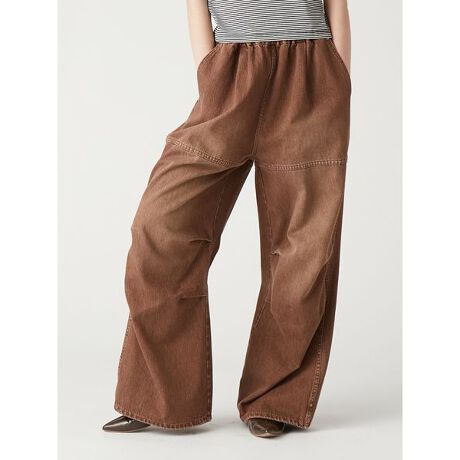 カラーデニムを製品加工した、ヴィンテージのようなデニムパンツです。気軽に着用できるようにウエストはゴム仕様になっております。ウエスト内側に紐も通っているのでサイズ調整も可能。ワークパンツのようなディティールで膝にタックを入れて、ワイドシルエットでメンズライクな雰囲気に仕上げました。トップスにフェミニンなアイテムと合わせたミックスコーディネートトがおすすめです。