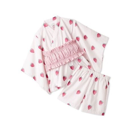毎夏お楽しみのKIDS甚平&浴衣シリーズに今年は帯付き甚平が初登場!キュートなイチゴ柄をプリントした帯付き浴衣セットです。汗ばむ季節にうれしい、肌離れの良いさらっとしたサッカー素材を使用しました。甚平型のトップスとショートパンツの組み合わせで、ゴム仕様でかぶるだけの帯は着脱がとてもスムーズ。見た目は浴衣ですが着崩れの心配もなく、大切な夏イベントを気持ちよく楽しんでいただけます。背中にはPOPな発泡プリントでブランドロゴ入り。柄違いのKIDS甚平やBABY甚平と合わせれば、きょうだいで可愛いリンク・コーディネートもお楽しみいただけます。