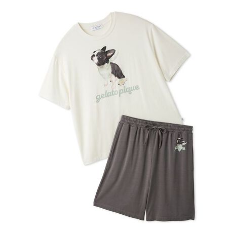 お散歩の時間が待ち遠しくて仕方ない。オーナー様を見上げるボストンテリアの子犬を描いた、接触冷感素材のセットアップです。ひんやりした肌触りのプリントTシャツは、バンダナを巻き、スニーカーをはいてスタンバイしている子犬の愛くるしい姿がたまらない1枚。ポケット付きのハーフパンツも、左腰に同様のプリントが入っています。色は涼しげなオフホワイトとネイビー、ダークグレーの全3色をご用意。ギフトにもおすすめのアイテムです。