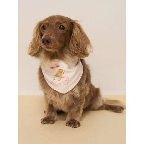 サングラス焼けしたお顔に思わず胸きゅん。夏をめいっぱい楽しむベアをテーマにした、オーナー様とお揃いでコーディネート可能なSUMMER BEARシリーズです。プールサイドでのんびりアイスを食べるベアをワンポイントでプリントした、保冷剤ポケット付きのバンダナ。暑い時期のお出かけにもおすすめです。色はアイボリーとピンクの2色展開。同シリーズのプルオーバーを合わせたり、オーナー様のルームウェアとリンク・コーディネートもお楽しみいただけます。