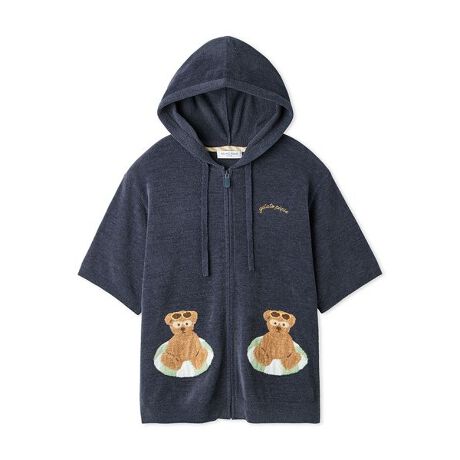 サングラス焼けしたお顔に思わず胸きゅん。夏をめいっぱい楽しむベアをテーマにした、ファミリーやカップルでお楽しみいただけるSUMMER BEARシリーズです。浮き輪でひと休みするベアをジャガードで描いた、 HOMMEサイズの半袖ジップパーカ。柔らかな風合いの薄手ニットを使用し、Tシャツやワンピースなど幅広いコーディネートの羽織りに重宝する1枚です。落ち着いたネイビーをベースに、サングラスや浮き輪、ロゴ刺繍の夏らしい配色がHAPPYな気分を演出してくれます。同シリーズのハーフパンツと合わせたり、LADIES’とペア・コーディネートも可能。JUNIOR、KIDS、BABYとのリンク・コーディネートもお楽しみください。