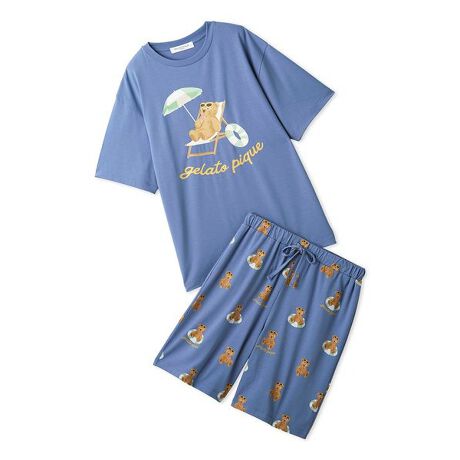 サングラス焼けしたお顔に思わず胸きゅん。夏をめいっぱい楽しむベアをテーマにした、ファミリーやカップルでお楽しみいただけるSUMMER BEARシリーズです。プールサイドでのんびり過ごすベアを描いたワンポイントTシャツと、総柄プリントのハーフパンツを組み合わせたHOMMEサイズのセットアップ。サングラスや浮き輪、ロゴのカラフルな配色で、おうち時間にHAPPYな気分を添えます。柔らかなベア天竺の接触冷感素材を使用し、汗ばむ時期のお風呂上がりやおやすみの時間にもおすすめです。色はアイボリーとネイビーの2色展開。LADIES’、KIDS、BABYとリンク・コーディネートしたり、ギフトにもおすすめのアイテムです。