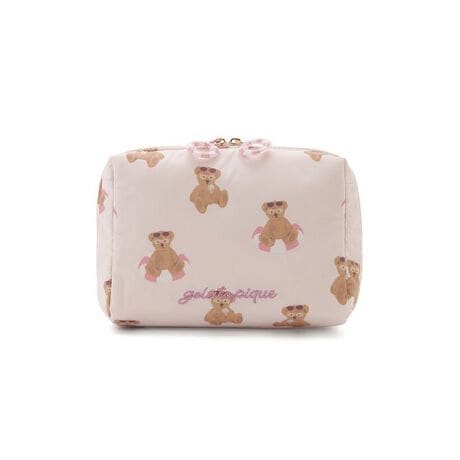 サングラス焼けしたお顔に思わず胸きゅん。夏をめいっぱい楽しむベアをテーマにした、SUMMER BEARの小物シリーズです。浮き輪でひと休みしたり、アイスを食べたり、プールサイドでのんびり過ごすベアを総柄プリントしたスクエア型のポーチ。コスメなどがたっぷり入るマチと、複数の内ポケット付きで使いやすく仕上げました。カラフルな浮き輪の形をしたファスナーの引き手と、ワンポイントのロゴ刺繍もポイントです。色はアイボリーとピンク、ミントの3色展開。同シリーズのルームウェアや雑貨とコーディネートしてお楽しみください。