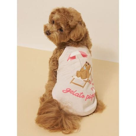 サングラス焼けしたお顔に思わず胸きゅん。夏をめいっぱい楽しむベアをテーマにした、オーナー様とお揃いでコーディネート可能なSUMMER BEARシリーズです。プールサイドでのんびりアイスを食べるベアを背中にプリントした、柔らかい接触冷感のベア天竺プルオーバー。スイムウェア風の涼しげなシルエットと背中のぷっくりとした発泡ロゴプリントがポイントです。背面に保冷剤を入れられる小さなポケットも付いているので、暑い時期のお出かけにもおすすめです。色はアイボリーとピンク、ネイビーの3色展開。同シリーズの雑貨を合わせたり、オーナー様のルームウェアとリンク・コーディネートもお楽しみいただけます。