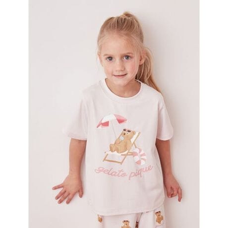 サングラス焼けしたお顔に思わず胸きゅん。夏をめいっぱい楽しむベアをテーマにした、ファミリーやカップルでお楽しみいただけるSUMMER BEARシリーズです。プールサイドでのんびりアイスを食べるベアを描いた、夏の気分たっぷりのKIDSワンポイントTシャツ。サングラスや浮き輪、ロゴのカラフルな配色で、おうち時間にHAPPYな気分を添えます。柔らかなベア天竺に接触冷感素材を使用し、汗ばむ時期のお風呂上がりやおやすみの時間にもおすすめです。色はピンクとネイビーの2色展開。同シリーズのショートパンツと合わせたり、LADIES’、HOMME、JUNIOR、BABYとのリンク・コーディネートもお楽しみください。