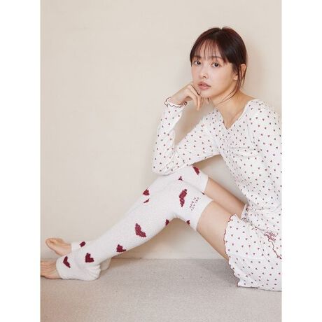 モコモコとした風合いの心地良いニット素材に、ハート柄のジャガードをデザインしたONLINE限定のシリーズです。大人の可愛さを意識したハート柄に、ワンポイントでロゴ刺繍を添えた着圧ソックス。つま先を開けたストレスフリーな着用感と程良い着圧感で、疲れがたまった足元をすっきりとサポートします。色はオフホワイトとピンク、グレーの3色をご用意しました。同シリーズのウエストウォーマーパンツやナイトブラと組み合わせたり、ギフトにもおすすめのアイテムです。