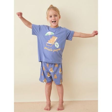 サングラス焼けしたお顔に思わず胸きゅん。夏をめいっぱい楽しむベアをテーマにした、ファミリーやカップルでお楽しみいただけるSUMMER BEARシリーズです。浮き輪でひと休みしたり、アイスを食べたり、プールサイドでのんびり過ごすベアを総柄プリントしたKIDSサイズのショートパンツ。サングラスや浮き輪、ロゴのカラフルな配色で、おうち時間にHAPPYな気分を添えます。柔らかなベア天竺に接触冷感素材を使用し、汗ばむ時期のお風呂上がりやおやすみの時間にも心地よい着用感。右後ろにポケットがひとつ付いています。色はピンクとネイビーの2色展開。同シリーズのTシャツと合わせたり、LADIES’、HOMME、JUNIOR、BABYとのリンク・コーディネートもお楽しみください。
