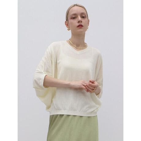 汎用性の高いミニマルなデザインにドルマン型のゆったりさがデイリーに重宝するニット。リラックス感がありながらも、ほのかなシアー感が女性らしい柔らかな印象に。季節の変わり目まで着られる5分袖が自然な体型カバーも◎。ボトムを選ばない着丈でワードローブに1枚あると嬉しいアイテムです。