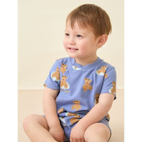 サングラス焼けしたお顔に思わず胸きゅん。夏をめいっぱい楽しむベアをテーマにした、ファミリーやカップルでお楽しみいただけるSUMMER BEARシリーズです。浮き輪でひと休みしたり、アイスを食べたり、プールサイドでのんびり過ごすベアを総柄プリントした半袖のロンパース。サングラスや浮き輪、ロゴのカラフルな配色で、おうち時間にHAPPYな気分を添えます。柔らかなベア天竺に接触冷感素材を使用し、汗ばむ時期のお風呂上がりやおやすみの時間にもおすすめ。伸縮性のある生地で着脱もスムーズです。色はピンクとネイビーの2色展開。同シリーズの雑貨と合わせたり、LADIES’、HOMME、JUNIOR、KIDSとのリンク・コーディネートもお楽しみください。