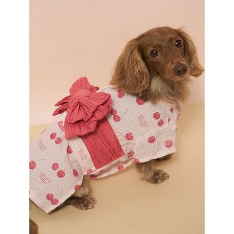 昨年の夏も大好評をいただいたCAT&DOG用浴衣シリーズが、より使いやすくアップデートして新登場です。夏の楽しいイベントシーンに映える、カラフルな4種類の絵柄をプリントしたダックスフンド用浴衣。今回の新作では、ハーネスを付けた上から浴衣を着用できるよう、首元にリードを通せる開口部を設けました。ダックスにちょうどよい長めの着丈。配色の帯を縫い付けたお腹周りはギャザー仕様で、動きやすくなっています。色はチェリー柄のピンク、アイス柄のイエロー、ダイナソー柄のライム、イルカ柄のブルーの4種類。きょうだいで色違いコーディネートもおすすめです。