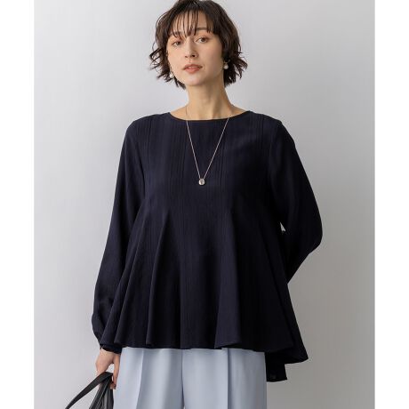 マチが入ったデザインが特徴の、一枚でサマになるブラウスです。胸の下まではすっきりと見せつつ、裾に向かって優雅に広がるフレアシルエットが、気になるお腹周りをカバーしてくれます。袖口の内側にはゴムが入っており、たくし上げることでふんわりとしたパフスリーブのような着こなしも楽しめます。コンパクトなクルーネックは、首元を上品に演出し、洗練された印象を与えます。 シンプルなパンツと合わせるだけで、オフィスにも対応できるきれいめスタイルが完成。デニムやカジュアルなボトムスと合わせれば、休日のリラックスしたお出かけスタイルにもぴったりです。一枚で着るだけでコーディネートが華やぎ、幅広いシーンで活躍する万能アイテムです。 カラーは、清潔感があり着回し力抜群のホワイト(#101)、顔色を明るく見せる爽やかなスカイブルー(#172)、知的で上品な印象を与えるネイビー(#175)の3色展開です。