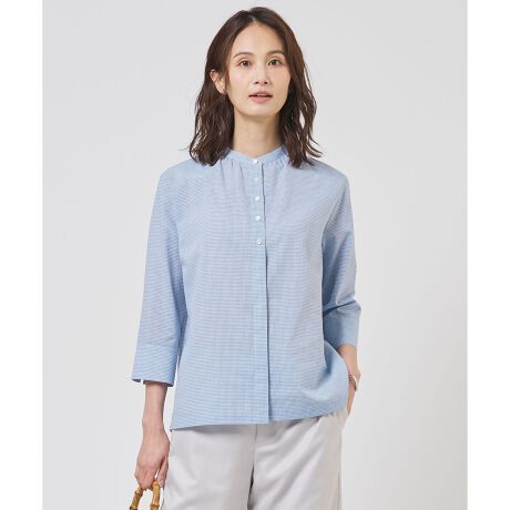 ■デザインフロント上部は釦を見せ、下部はボタンが隠れる比翼仕立てにした、表情のあるバンドカラーブラウス。主張しすぎない繊細なミニチェック柄が、大人の着こなしに上品な印象を与えてくれます。袖は軽く折り返して6分袖としても着用できます。1枚着できちんと感を演出するのはもちろん、カットソーなどに合わせて羽織りとしても着られる、汎用性の高いアイテムです。
